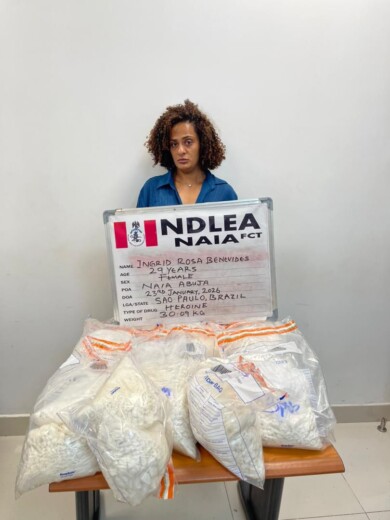 Operatives of the National Drug Law Enforcement Agency (NDLEA) have arrested a 30-year-old Brazilian lady, Ms. Ingrid Rosa Benevides, at the Nnamdi Azikiwe International Airport Abuja for bringing into Nigeria a total of 30.09 kilograms of white heroin concealed in factory sealed coffee packs worth over N3 billion in street value.