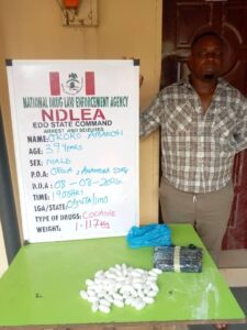 “In another intelligence-led operation, NDLEA operatives on Wednesday 7th August arrested a member of a cocaine trafficking network, Obiora Joseph Agudosi, at Alafia Orile, Amuwo Odofin area of Lagos while attempting to move 9.00kg of cocaine to Onitsha, Anambra state.