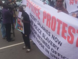 Some of the placards read: “Decent Salaries Now”, “End Police Slavery”, “Pensions for Police Officers” and “Dignity for Those in Uniform”.